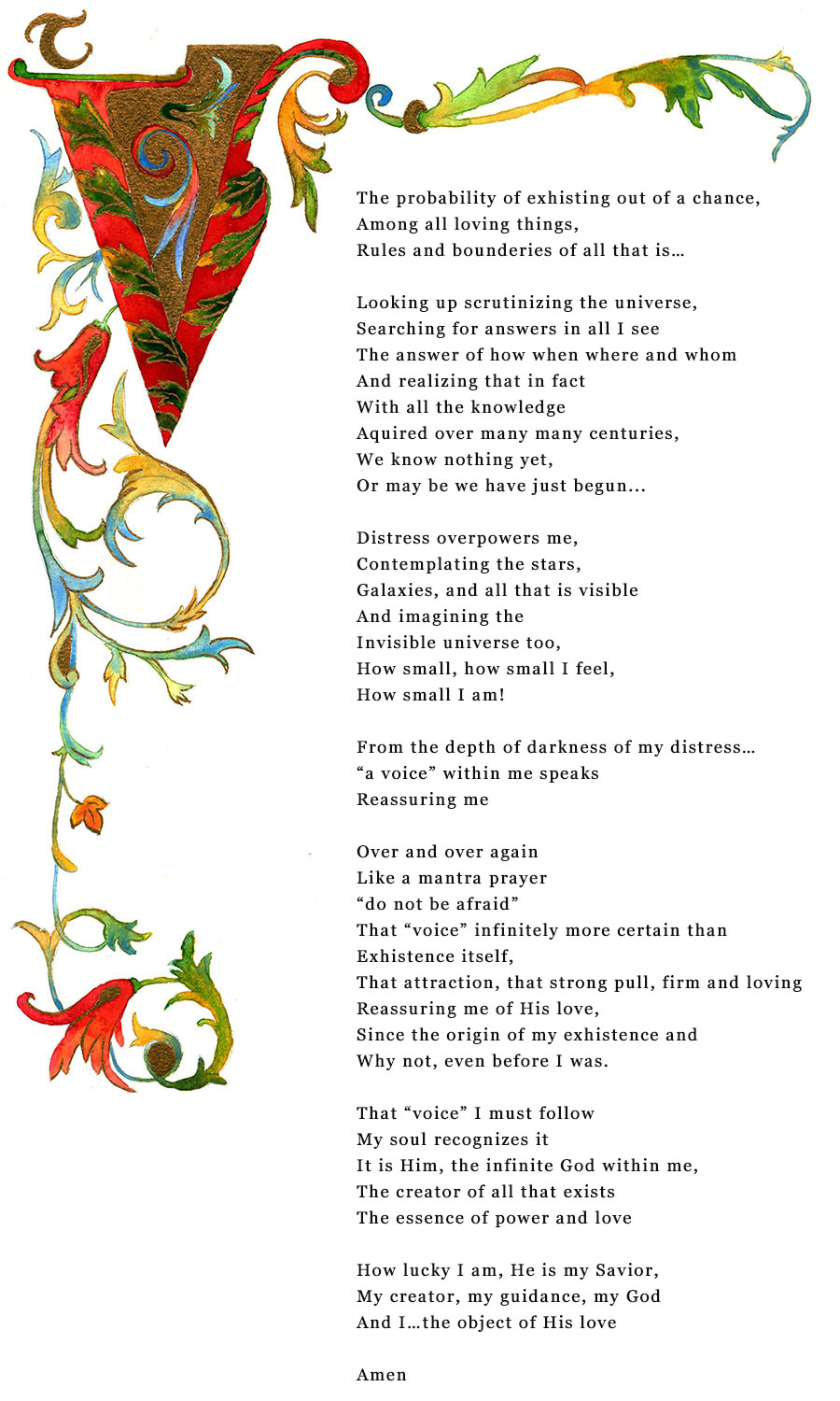 Over and over again Like a mantra prayer “do not be afraid” That “voice” infinitely more certain than Exhistence itself, That attraction, that strong pull, firm and loving Reassuring me of His love, Since the origin of my exhistence and Why not, even before I was.